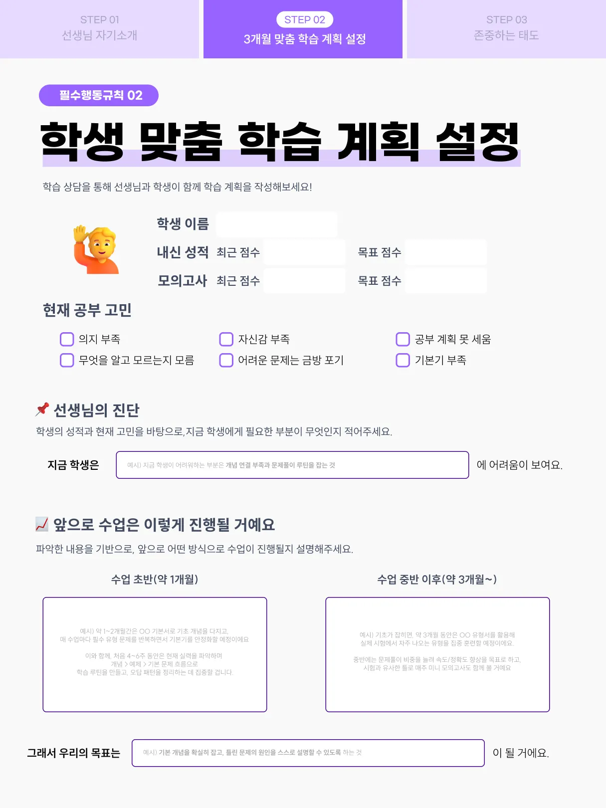 2단계: 학생 맞춤 학습 계획 설정 : 학생의 현재 학습 수준과 목표를 점검하고, 3개월 계획을 함께 세워보세요.