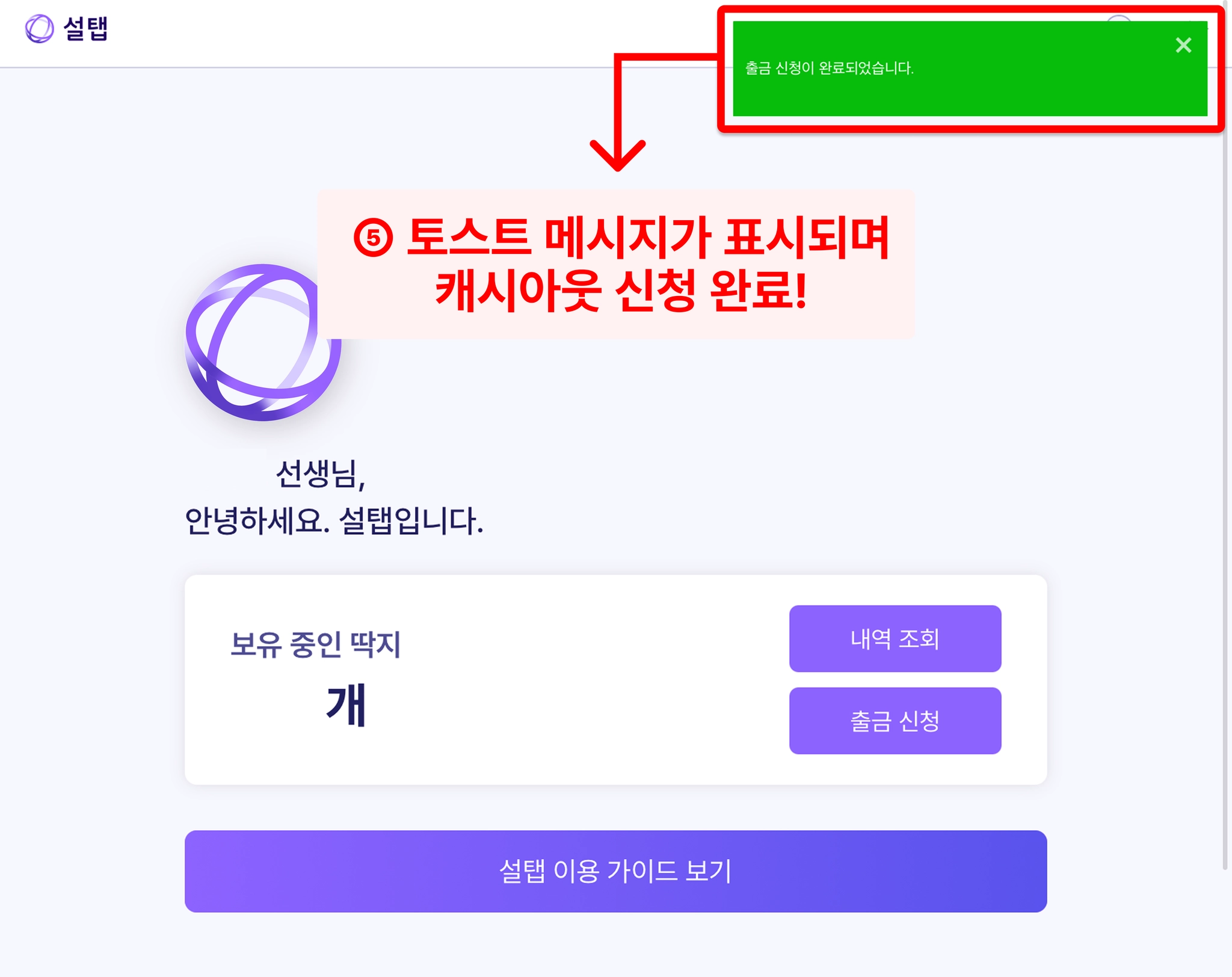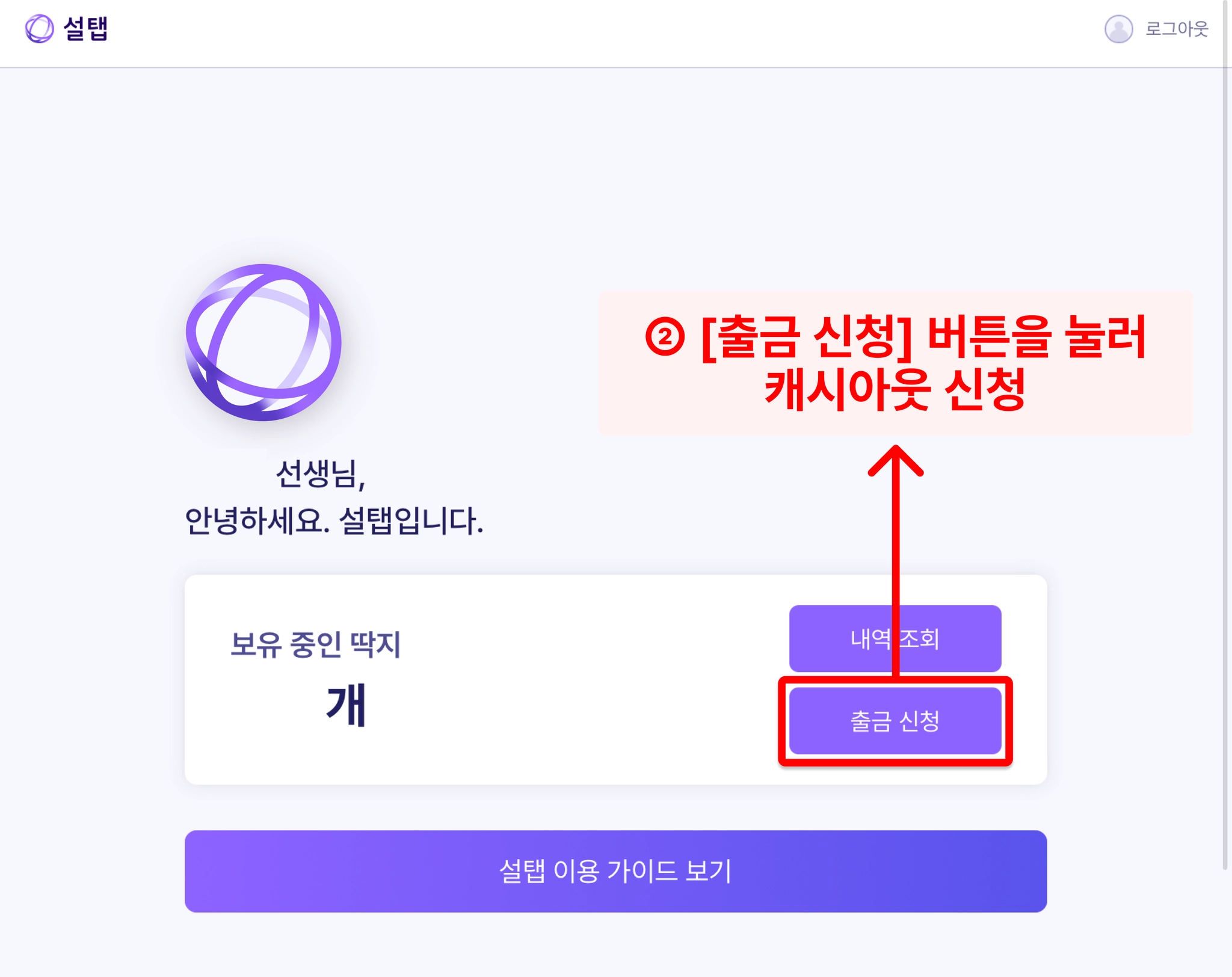 지급받은 딱지는 설탭 웹페이지에서 캐시아웃을 신청해 입금받을 수 있습니다.