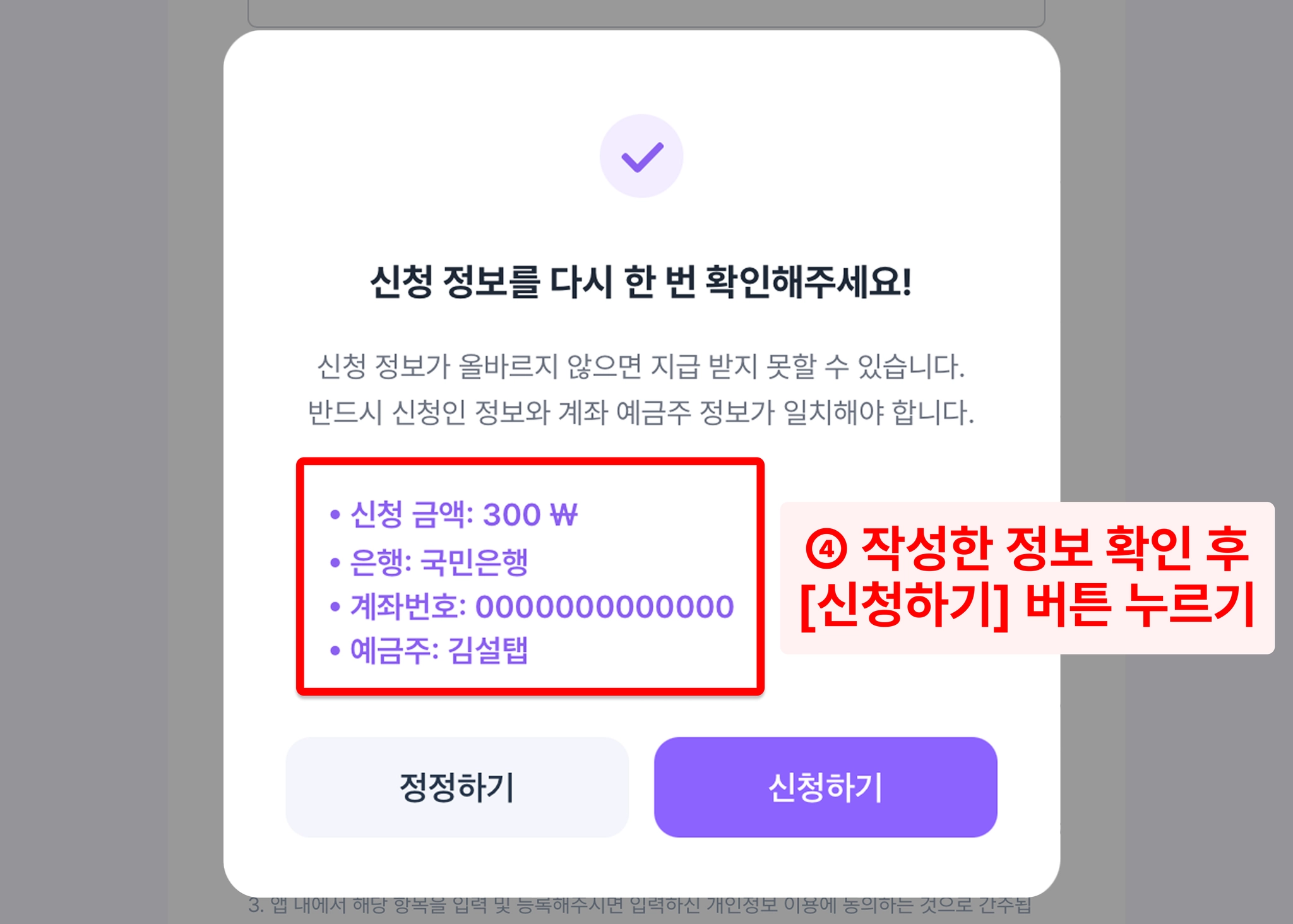 작성한 정보를 확인한 뒤 수정 필요한 정보는 [정정하기] 버튼을 눌러 수정해 주세요!