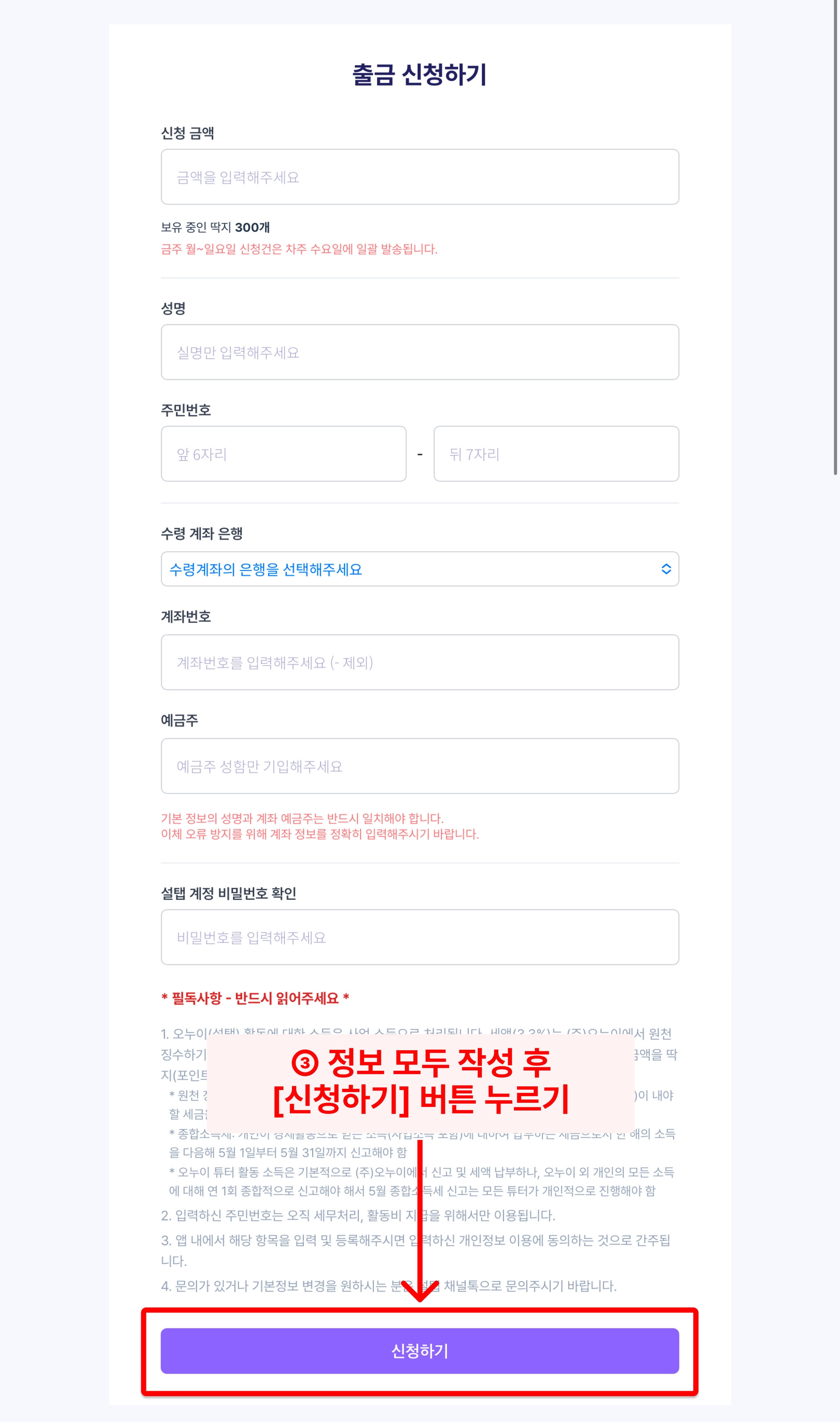 신청 정보를 모두 작성해야 [출금 신청] 버튼 활성화