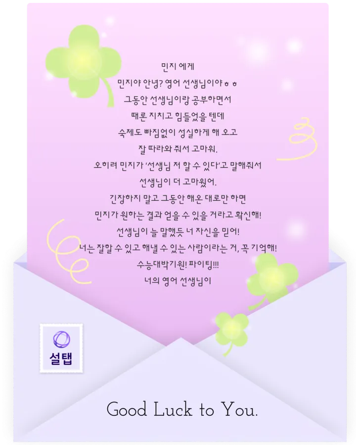 선생님들이 작성한 메시지는 각 담당 학생들에게 직접 전달되었으며, 설탭은 그 외 학생들에게도 진심 어린 응원을 전하기 위해 별도로 정성껏 작성한 메시지를 전달했습니다.