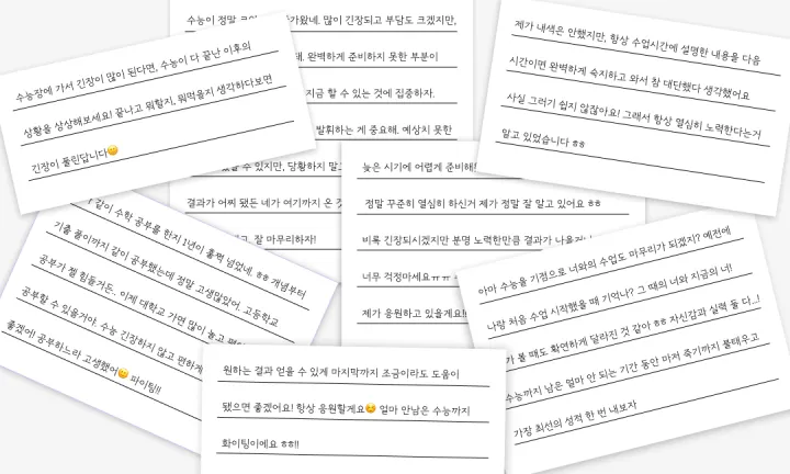 설탭의 선생님들이 작성한 응원 메시지에는 각자의 수험 시절에 대한 기억과 학생들과의 특별한 이야기가 담겨 있었습니다.